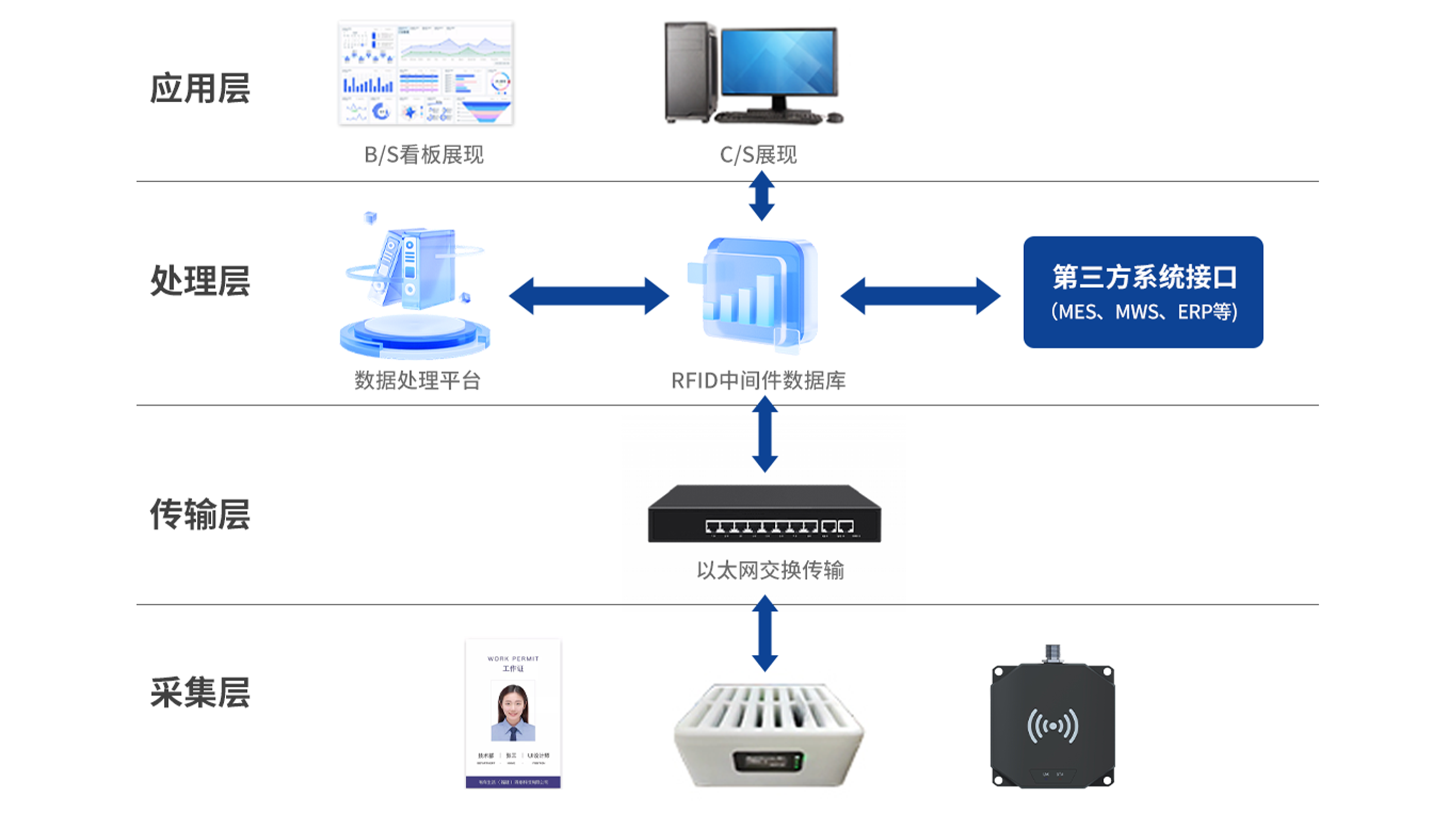 RFID技术通过非接触式自动识别,为解决上述痛点提供了理想的工具。一个典型的基于RFID的产线工位管理系统,其解决方案架构通常包含以下几个层面: