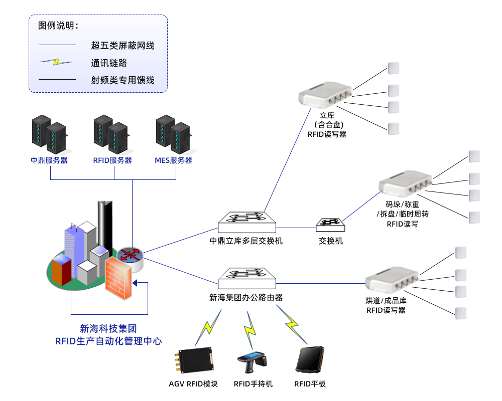 系统包含RFID读写器、RFID托盘标签、RFID周转箱标签、天线、数据服务器、RFID管理系统等,在仓库进出口、生产线等关键位置安装RFID读写器和天线,为每个托盘和周转箱配备RFID电子标签,并进行初始化设置,安装RFID仓储物流管理系统和数据管理系统,根据实际需求进行系统配置和初始化设置。